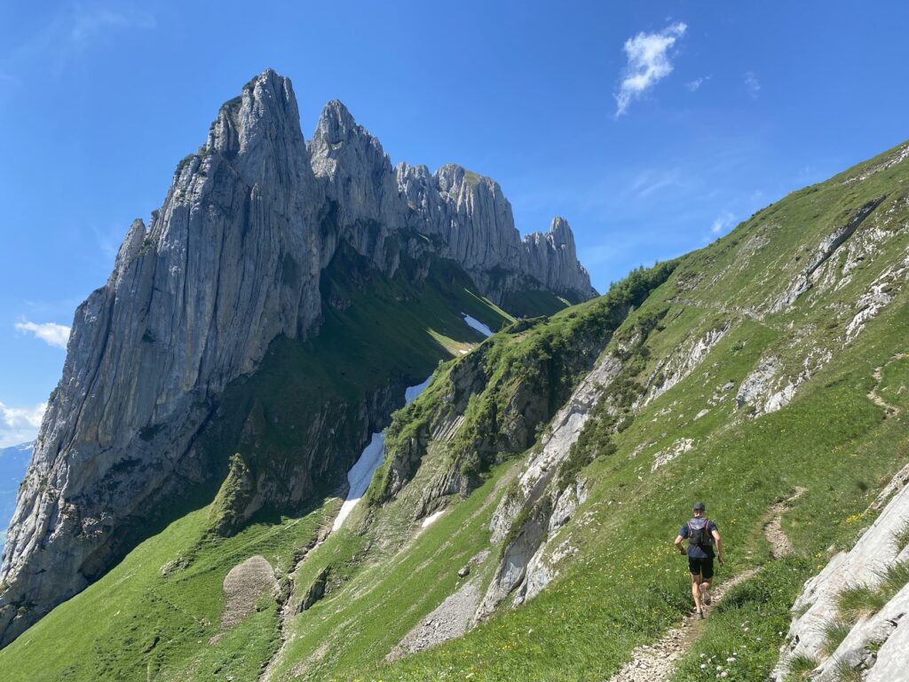 5-day hut-to-hut trek in the Alpstein as spring awakens. Let yourself be surprised by the Alpstein! Mountain ridges, lakes, and impressive peaks—you’ll never get tired of the views. During this week, you’ll likely wonder why this hidden hiking paradise is known to so few. We’re happy to keep it that way, because it lets us enjoy the peace and untouched nature even more. This is an accessible trek for anyone who wants to try a hut-to-hut hike for the first time or simply enjoy a long weekend of walking. Five days in the mountains will make you feel like you’ve been away for weeks. In this spring edition, we hike through colorful flower fields and the last remnants of winter snow, allowing you to experience the mountains at a truly special time of year. We are among the first guests of the season in the huts where we stay. The start of the new, still-quiet season creates that extra bit of personal connection with the welcoming hut hosts—something you’ll always remember. This short trek offers a perfect moment of relaxation just before summer.